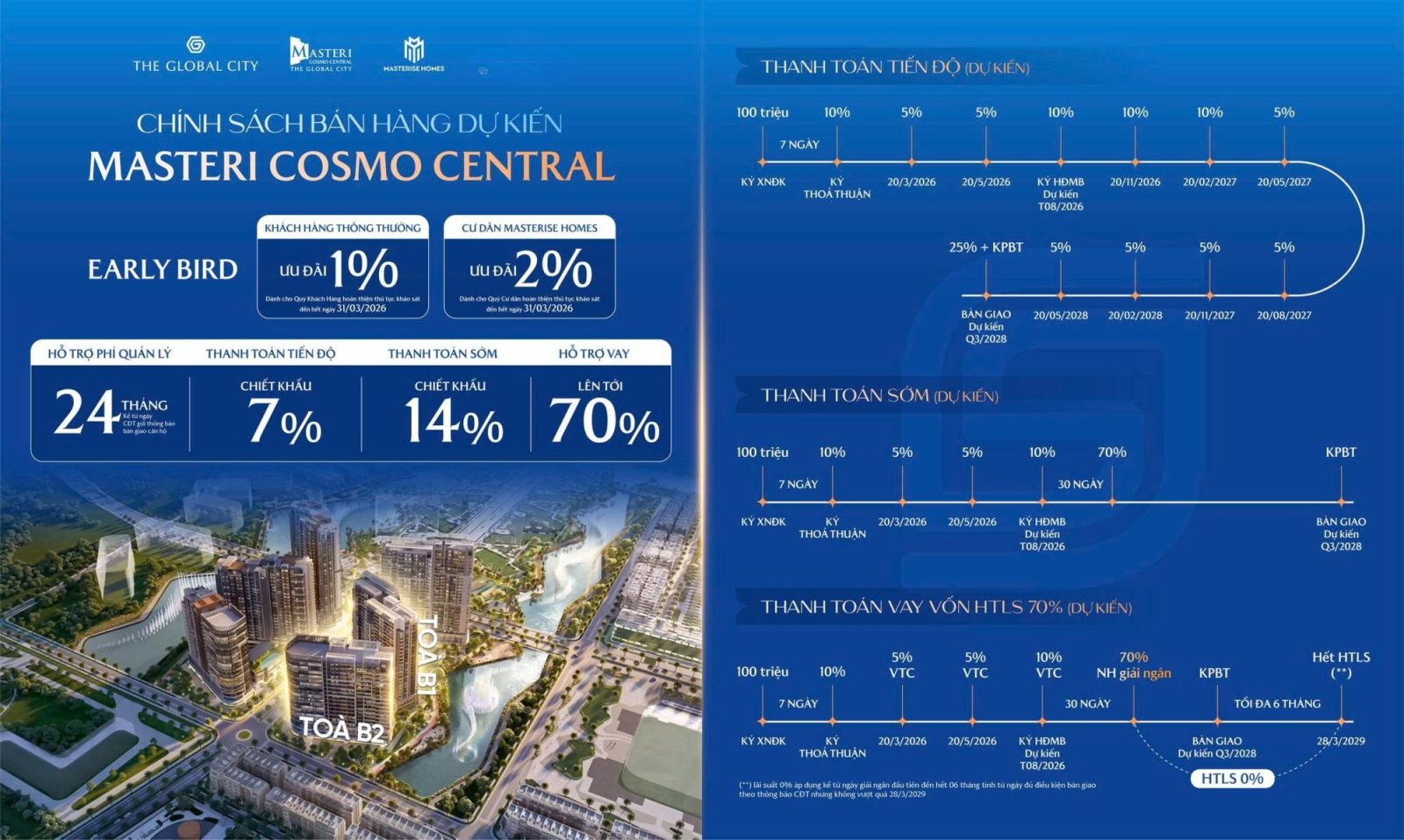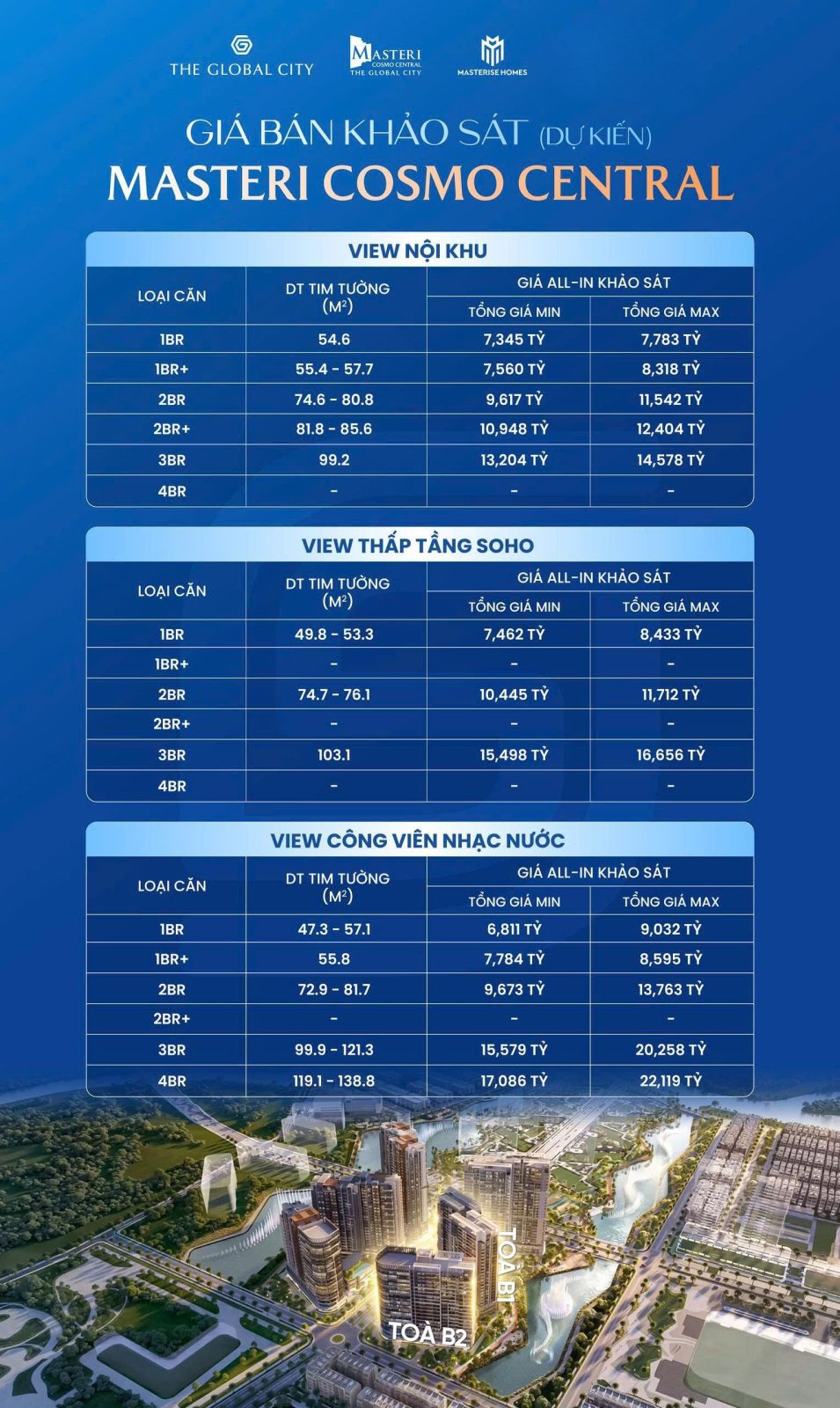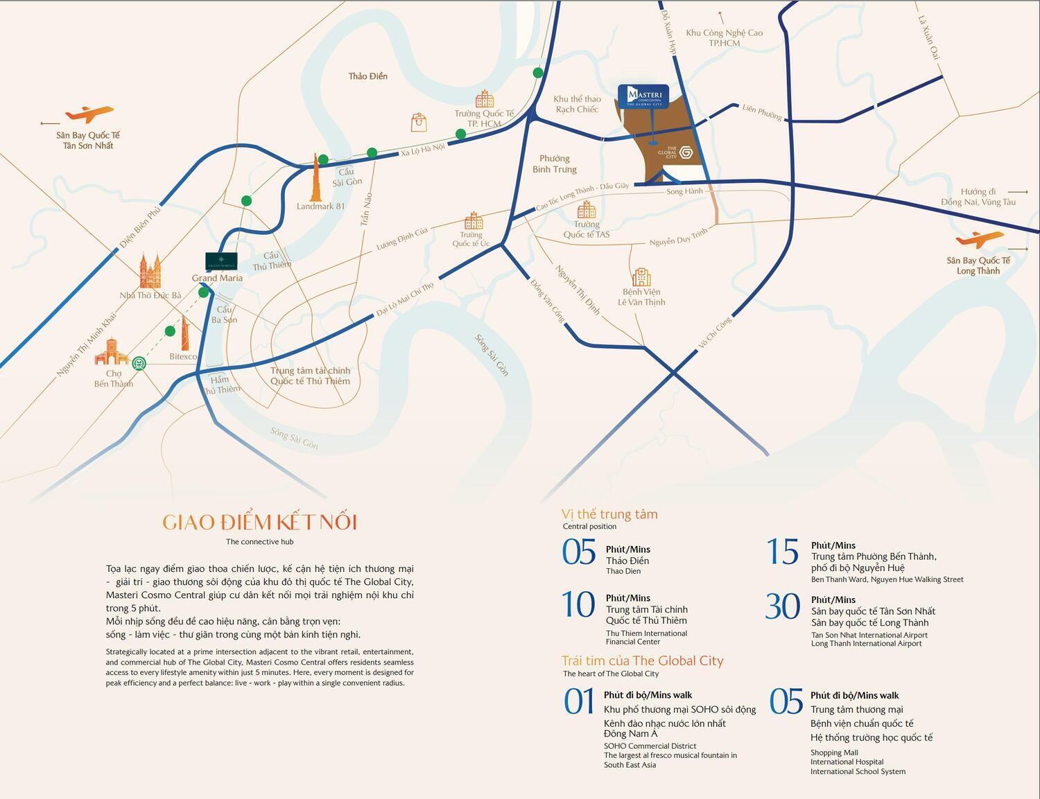 Masteri Cosmo Central khu nhà ở kết hợp văn phòng và thương mại dịch vụ đẹp nhất tại vị trí lõi trung tâm đại đô thị The Global City 117,4ha, khu đô thị quốc tế biểu tượng, kết nối nhanh Thảo Điền, Thủ Thiêm và lõi trung tâm Sài Gòn chỉ trong 5–10 phút, xung quanh là hệ thống dịch vụ tiện ích cao cấp: Kề cận TTTM 132.000m², kênh đào nhạc nước lớn nhất Đông Nam Á và phố thương mại SOHO, mọi trải nghiệm sống – làm việc – giải trí đều gói trọn trong một bán kính tiện nghi.